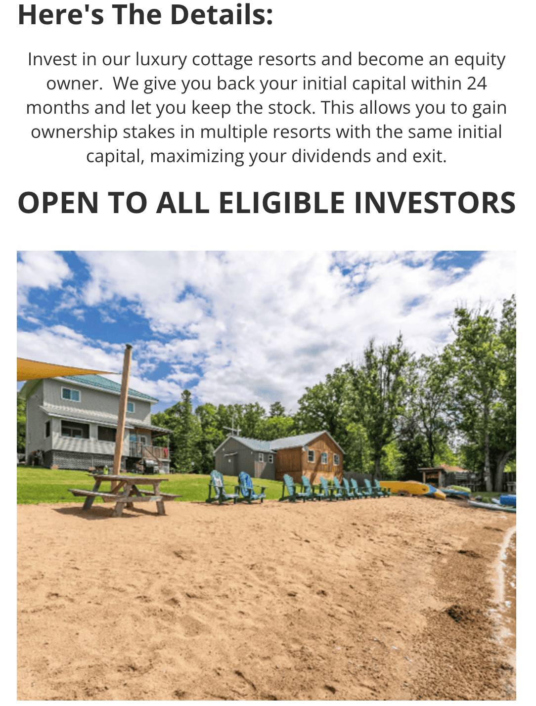 Invest in our luxury cottage resorts and become an equity owner. We give you back your initial capital within 24 months and let you keep the stock. This allows you to gain ownership stakes in multiple resorts with the same initial capital, maximizing your dividends and exit.
