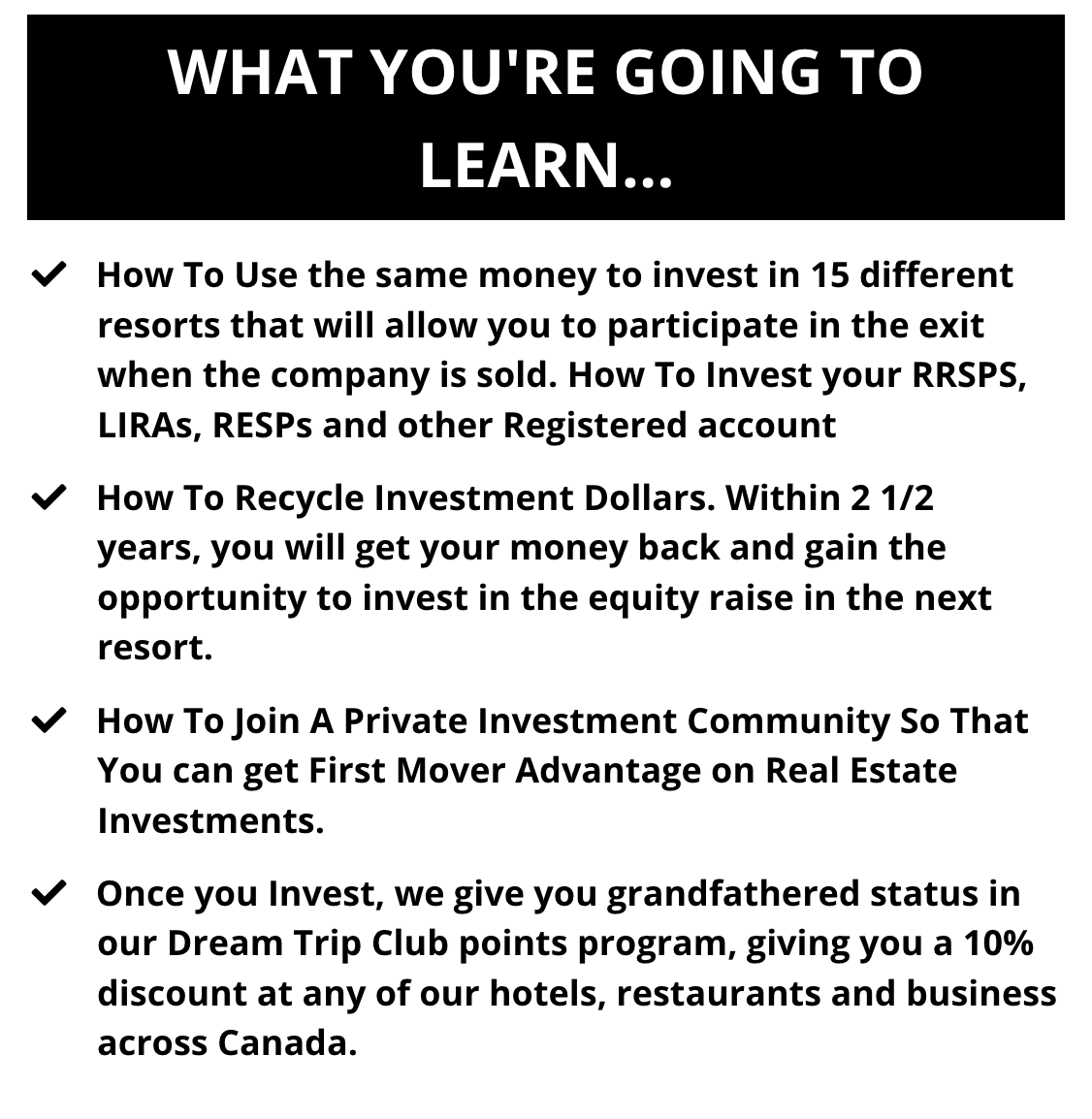 How To Use the same money to invest in 15 different resorts that will allow you to participate in the exit when the company is sold. How To Invest your RRSPS, LIRAs, RESPs and other Registered accounts